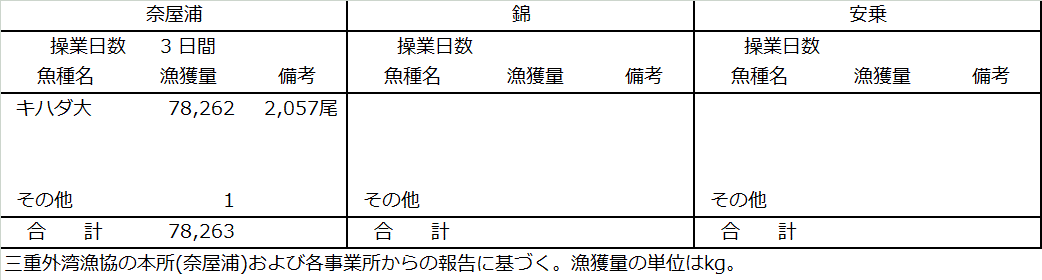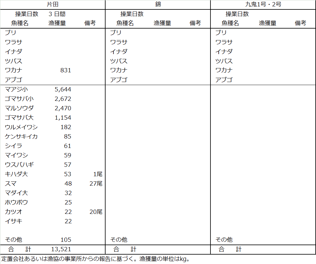 | 大型定置網 | マアジ5.6t、サバ類3.8t、マルソウダ2.5t、ワカナ0.8t、イワシ類0.2t |