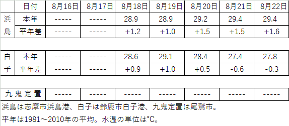 | 熊野灘周辺の概況 | 8月21日に実施した観測によると、御座岬沖の水温は、表面では26℃台後半、20mでは17℃台前半を観測。五ヶ所湾湾口の水温は、表面では26℃台後半、20mでは18℃台後半を観測した。 |