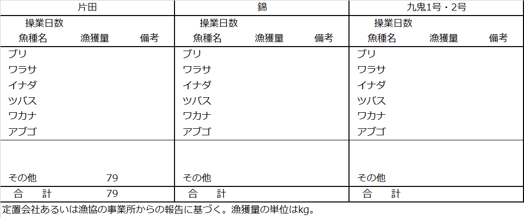 | 大型定置網 | 大型定置(片田・錦・九鬼)は休漁中 |