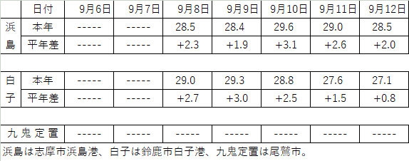 | 熊野灘周辺の概況 | 9月8-9日の調査船の観測結果によると、熊野灘沖合の表面水温は概ね27〜29℃前後で、ごく沿岸では平年並、沖合では平年より1〜2.5℃前後高めであった。熊野灘沖合には、黒潮系暖水が波及していた。 |