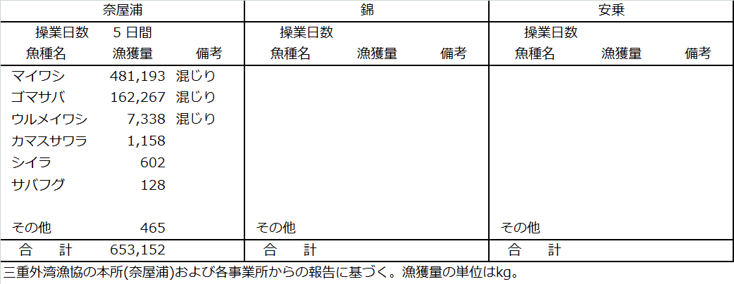 | 中型まき網 | マイワシ481t、ゴマサバ162t、ウルメイワシ7.3t、カマスサワラ1.2t、シイラ0.6t |