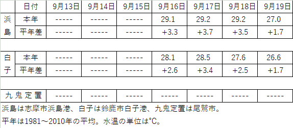 | 熊野灘周辺の概況 | 9月16日に調査船が実施した調査結果によると、浮魚礁海域の表面水温は、28〜29℃台で、北東寄りに0.5〜0.8kt前後の流れを観測した。三重県沿岸の潮位偏差は、10〜20cm前後低めで推移している。 |