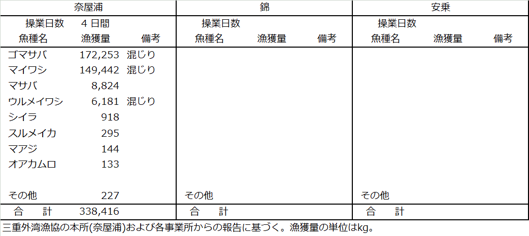 | 中型まき網 | ゴマサバ172t、マイワシ149t、マサバ8.8t、ウルメイワシ6.2t、シイラ0.9t |