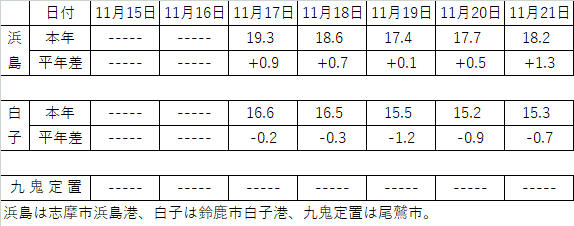 | 熊野灘周辺の概況 | 11月20日に調査船が実施した調査によると、浮魚礁の表面水温は、No.1では21℃台前半、No.2では23℃台前半、No.4では22℃台後半を観測した。No.1では北寄りに約0.5〜0.6kt、No.2では北西寄りに約1.2〜1.3kt、No.4では南西寄りに約0.5ktの流れを観測した。 |
