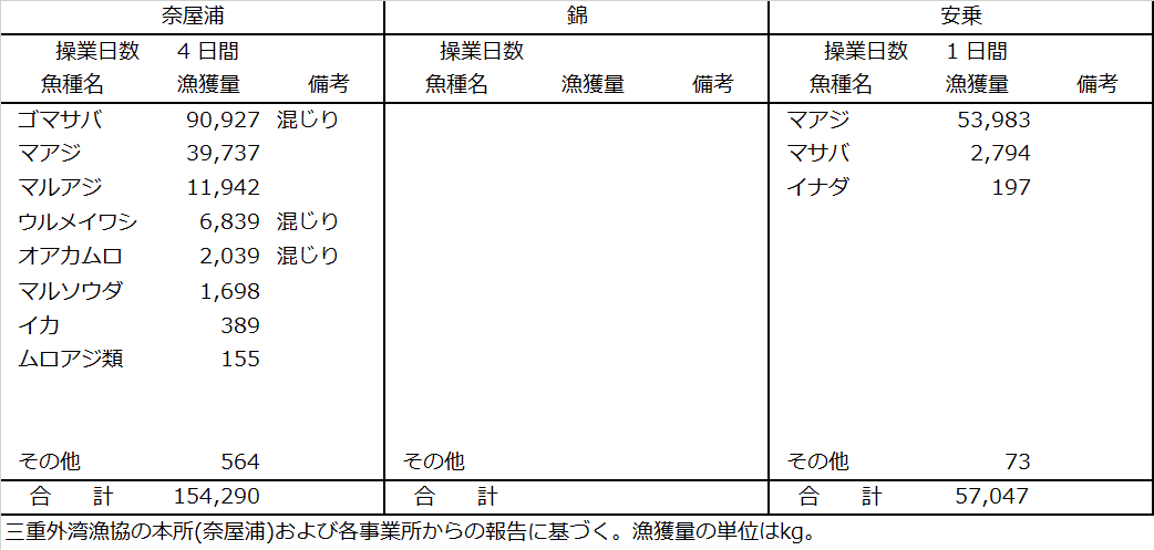| 中型まき網 | マアジ94t、ゴマサバ91t、マルアジ12t、ウルメイワシ6.8t、マサバ2.8t |
