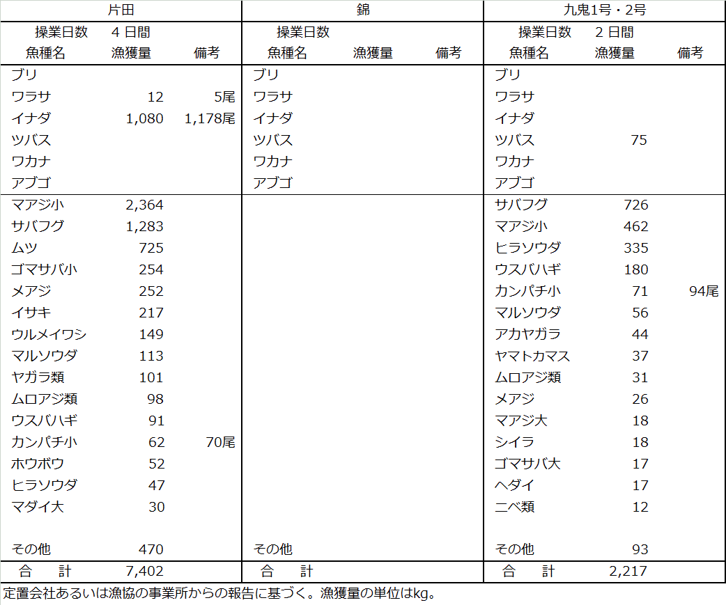 | 大型定置網 | マアジ2.8t、サバフグ2.0t、イナダ1.1t、ムツ0.7t、ヒラソウダ0.4t |