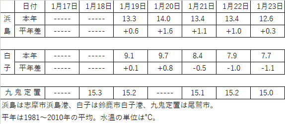 | 熊野灘周辺の概況 | 1月19〜20日に実施した調査船の観測によると、熊野灘沿岸の表面及び50mの水温は概ね15〜16℃台で平年より0.5〜2℃ほど低めであった。浮魚礁No.1の表面水温は、1/19に約2.5℃低下し、15℃台で推移している。 |