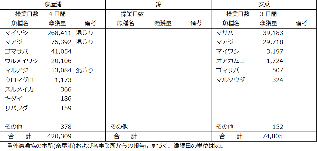 | 中型まき網 | マイワシ272t、マアジ105t、ゴマサバ42t、マサバ39t、ウルメイワシ20t |