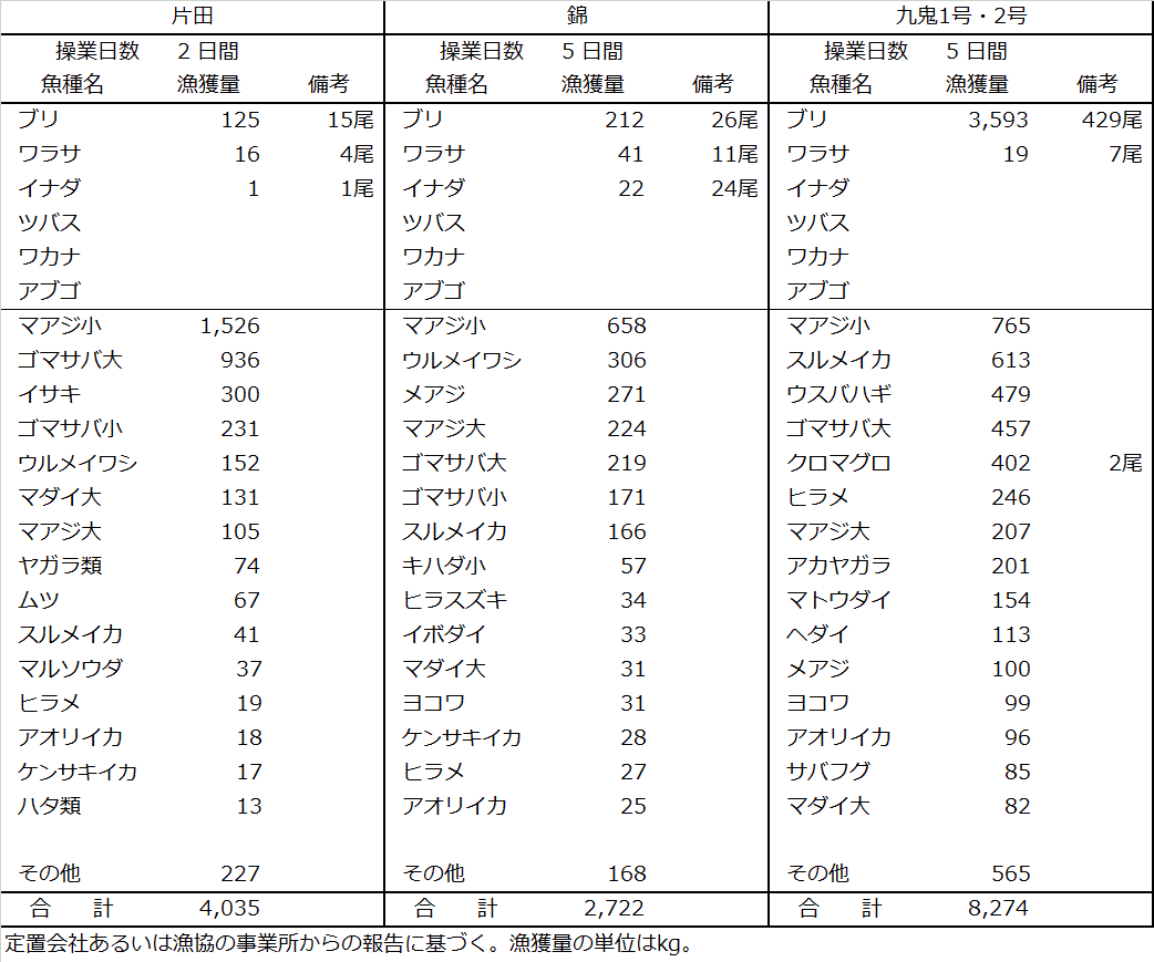 | 大型定置網 | ブリ3.9t、マアジ3.5t、サバ類2.0t、スルメイカ0.8t、ウスバハギ0.5t |