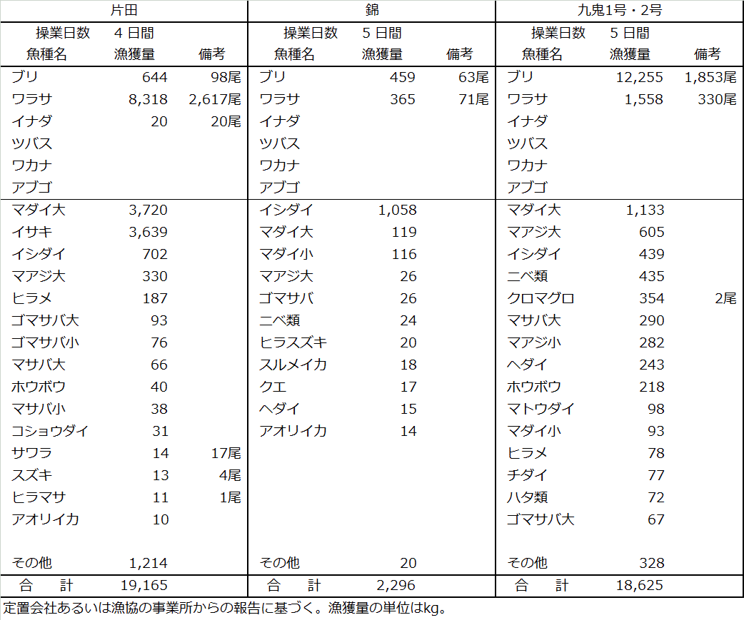 | 大型定置網 | ブリ13t、ワラサ10t、マダイ5.2t、イサキ3.6t、イシダイ2.2t |