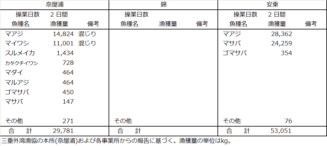 | 中型まき網 | マアジ43t、マサバ24t、マイワシ11t、スルメイカ1.4t、ゴマサバ0.8t |