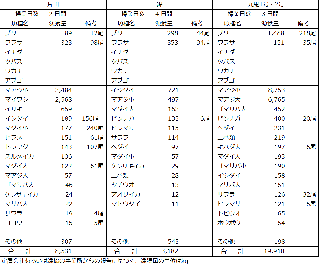 | 大型定置網 | マアジ20t、イワシ類2.6t、ブリ1.9t、イシダイ1.1t、サバ類0.9t |