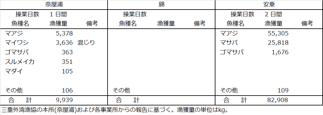 | 中型まき網 | マアジ61t、マサバ26t、マイワシ3.6t、ゴマサバ2.0t、スルメイカ0.4t |