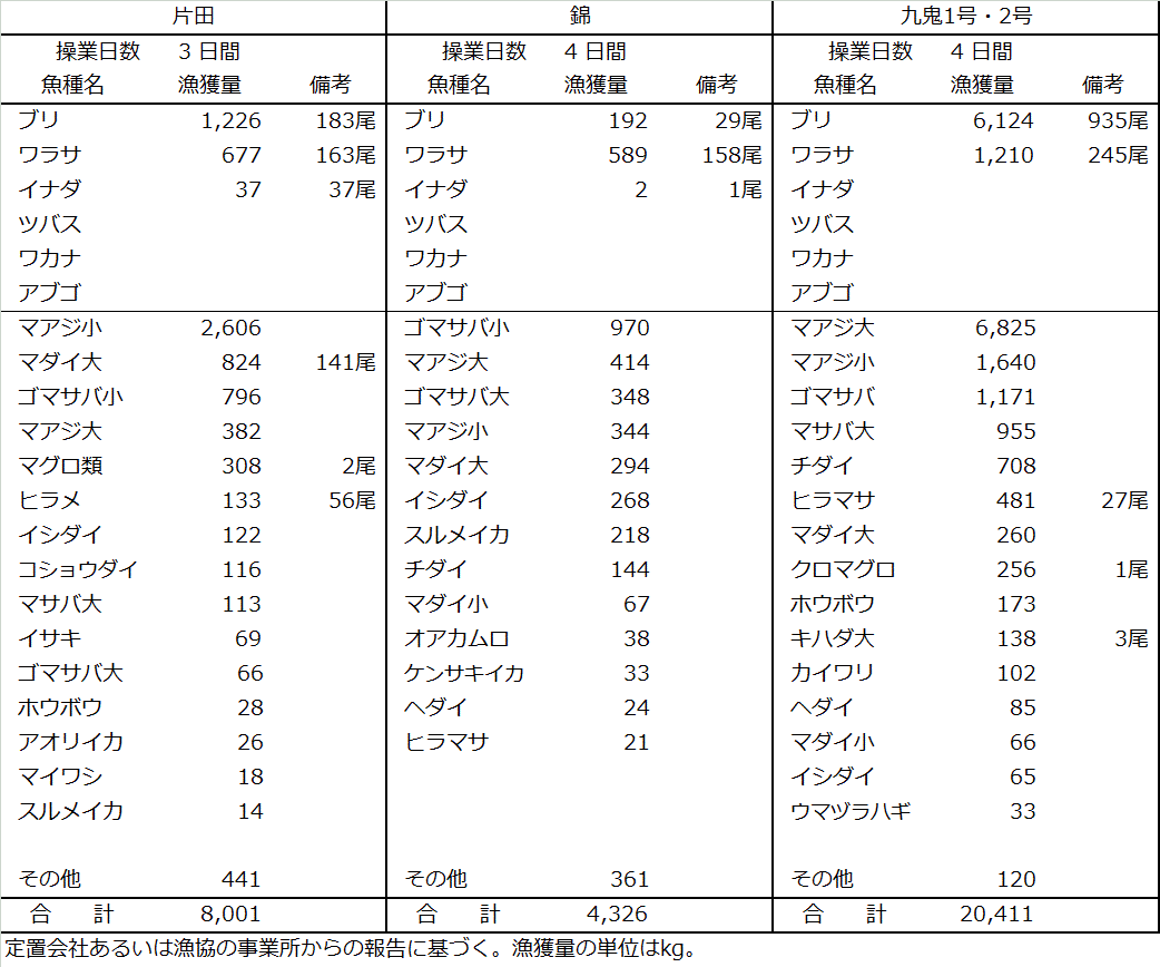 | 大型定置網 | マアジ12t、ブリ7.5t、サバ類4.4t、ワラサ2.5t、マダイ1.5t |