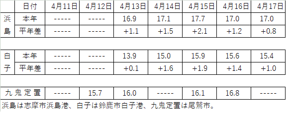 | 熊野灘周辺の概況 | 定置ブイの水深10m水温は、片田では14℃台、阿田和では17℃台で推移。昨年同期の水深10m水温は、片田及び阿田和では17℃台で、片田では3℃低い。 |