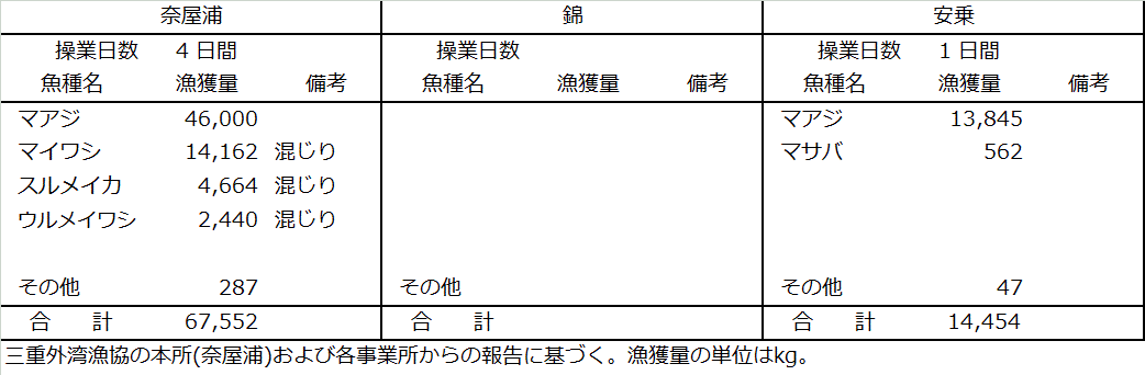 | 中型まき網 | マアジ60t、マイワシ14t、スルメイカ4.7t、ウルメイワシ2.4t、マサバ0.6t |