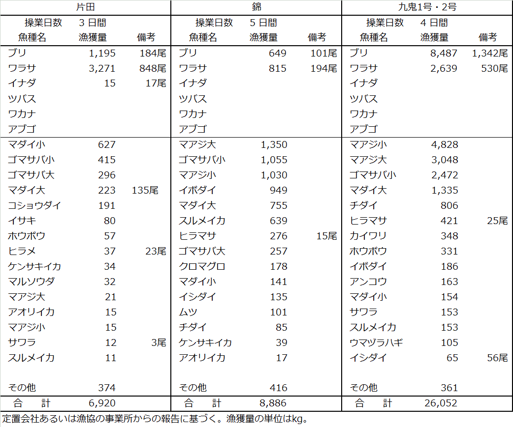 | 大型定置網 | ブリ10t、マアジ10t、ワラサ6.7t、サバ類4.5t、マダイ3.2t |